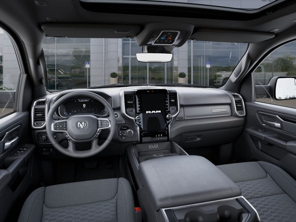 Many rewarding details are standard in our Big Horn cabin, starting with the Level 2 Equipment Packs universal garage door opener, power adjustable pedals, power sliding rear window, comfortable heated deluxe cloth seats, a heated leather-wrapped steering wheel, dual climate control, air conditioning, a RAM Clean-Air System, keyless access, push-button ignition, cruise control, remote start, door-sill scuff plates, clever cargo space, a 7-inch color display, Uconnect 5 with a 12.0-inch touchscreen, features voice control, Bluetooth, and a nine-speaker sound system for intelligent infotainment.
