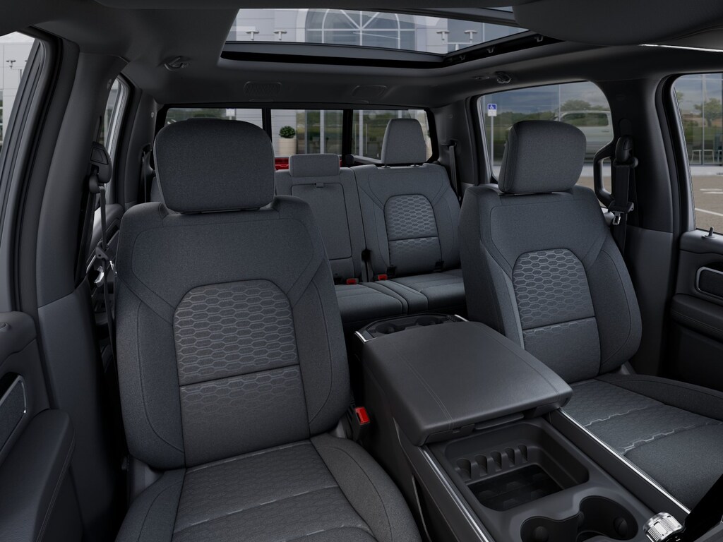 Our Big Horn cabin has been tailored to fit your needs, with the Level 2 Equipment Packages heated deluxe cloth seats, a heated leather-wrapped steering wheel, universal home remote, power adjustable pedals, power sliding rear window, dual climate control, a RAM Clean-Air System, keyless access, push-button ignition, cruise control, door-sill scuff plates, and clever cargo space, and a Uconnect 5 with 12.0-inch touchscreen features voice control, Bluetooth, and a nine-speaker sound system for intelligent infotainment.